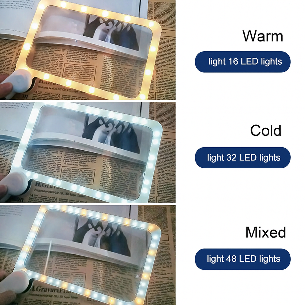 The magnifying glass features 48 LED lights with cold, warm, and mixed lighting modes. This versatility lets you adjust brightness effortlessly to fit your environment, ensuring comfortable reading whether it’s day or night without any glare.